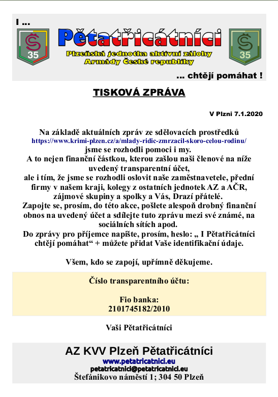 I když se tato zpráva netýká přímo Vaší rodiny či známých, přesto se svým rozsahem, který se vymyká běžné události, nás všech může týkat. Přátelé prosím, abyste se podívali na přiloženou Tiskovou zprávu a pomohli nám zlepšit to, co se stalo.
